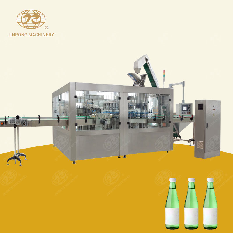 玻璃瓶果汁灌裝機(jī)主要用于玻璃瓶果汁飲料的生產(chǎn),成套玻璃瓶果汁生產(chǎn)線適合芒果汁、藍(lán)莓汁、桑葚汁、菠蘿汁、檸檬汁、柚子汁等。在玻璃瓶灌裝一體機(jī)上實(shí)現(xiàn)沖洗,灌裝,三旋蓋和四旋蓋等封口的功能。玻璃瓶果汁灌裝機(jī)械具有結(jié)構(gòu)緊湊、占地面積小、設(shè)計(jì)科學(xué)合理、造型美觀、操作維修方便,自動化程度高等特點(diǎn),適合中小型果汁廠。玻璃瓶果汁灌裝機(jī)采用卡瓶頸懸掛工態(tài)設(shè)計(jì),且采用灌裝閥升降,采用人機(jī)界面觸摸屏控制、PLC電腦控制、變頻器控制等技術(shù)。